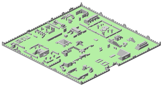 The city (shown here in all its glory) is mapped in the top 16k of memory. Each vertical column is represented by one byte - there are 128x128 columns of city space. On this map, the data starts at the left, runs along the top-left wall to the top, then repeats for the next row, until finally the last 128 bytes represent the front wall of the city.