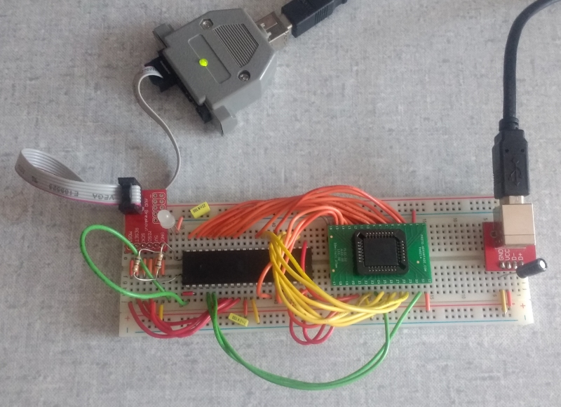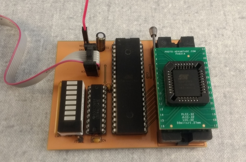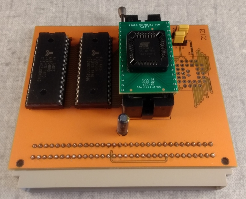 In this case, the ROM is actually a flash memory chip in a ZIF socket. I did some breadboarding to make sure I knew how to write to flash memory: