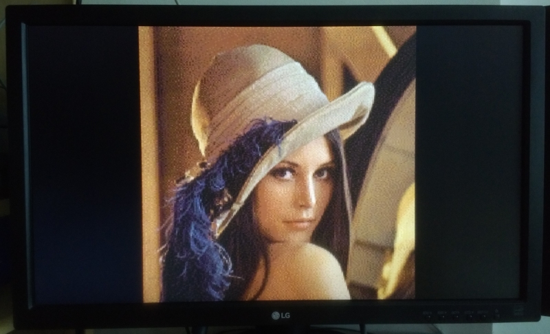 Switching in the clock divider got serial communications working reliably, so I could download suitably converted images from the PC. Here's the first image I tested it with, a popular but controversial choice: