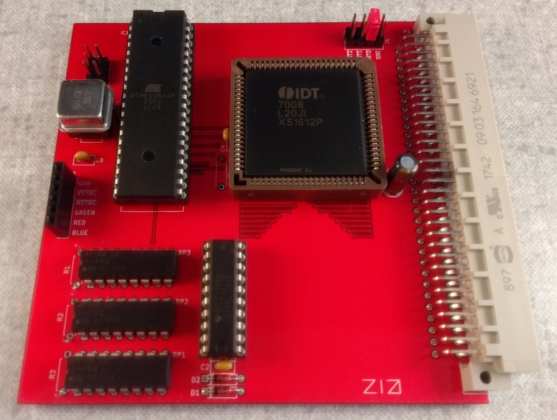 The square chip is the video RAM. The large rectangular chip is the AVR ATMega644P, which spits out VRAM addresses, horizontal and vertical sync signals, and vertical blanking interrupts. Bytes from VRAM pass through a buffer chip, and the red, green and blue bits go to resistor arrays to be turned into analogue voltages.