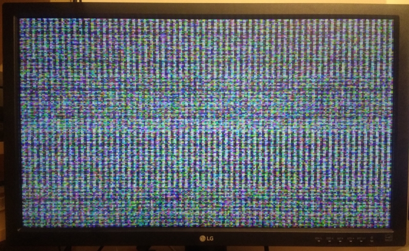 Once I'd built this card, I initially ran it without RAM, letting the AVR chip generate its own test patterns. Then I added the VRAM chip and updated the firmware to route data from VRAM to the video output, at which point the card just displayed the random contents of uninitialised video memory. Unexpectedly, there is a visible pattern of vertical and horizontal stripes in what I expected to be random data, which I guess is a quirk of the VRAM chip's physical characteristics:
