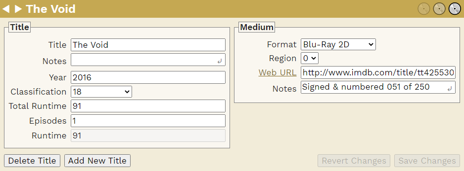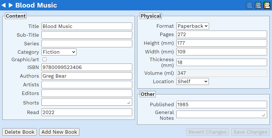 Asset data is stored as JSON in a single database column, along with a schema in a settings table. This meets the client's requirement for the schema to be easily editable, without requiring changes to the SQL database structure. It also makes the software sufficiently flexible to be used for other purposes: As soon as possible in development, I started dogfooding it as an address book, databases for personal book and DVD/Blu-Ray collections (below), and even as the software's own issue tracker. Multiple databases can co-exist on the same server, with configuration options allowing a different interface colour and menu icon per instance (handy for telling at a glance whether I'm in testing or production!). Each instance also has its own JavaScript file for field-value calculations, like runtime-per-episode and book volume shown below.
