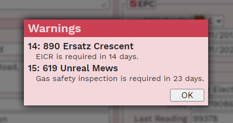 Date fields can have deadlines attached; when these are impending or missed, on-screen warnings are provided at startup or on request (below, left).